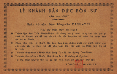 Cũng năm 1958, Đại hội ngày mùng 8 tháng tư năm Mậu Tuất, Ngài ban hành Huấn Từ, khuyến nhủ hậu sự, không ai ngờ rằng đó là lời di huấn.
